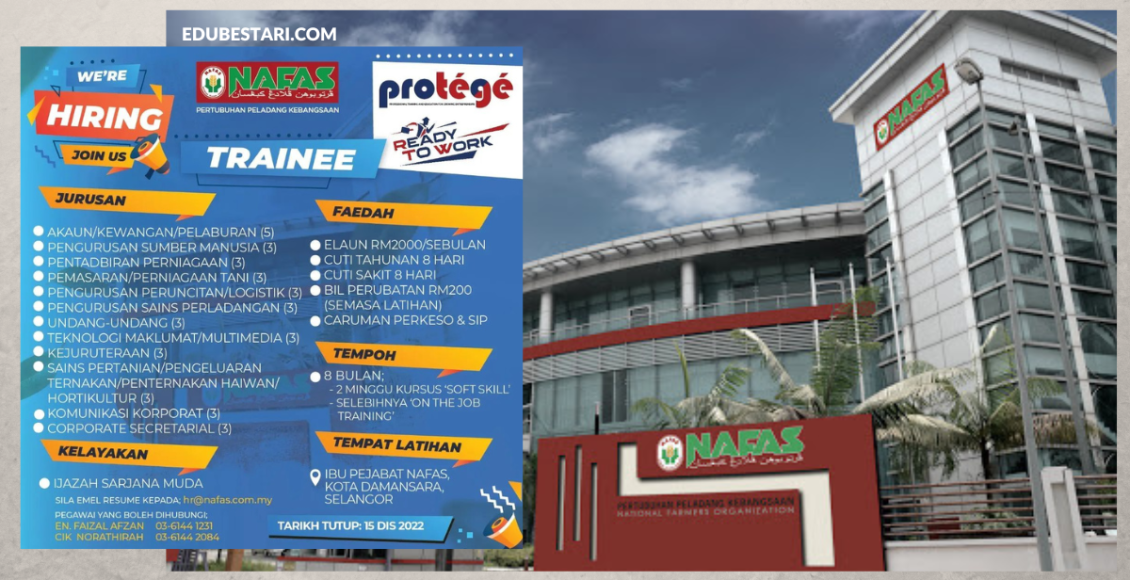 Graduan yang berminat dengan program yang ditawarkan dan bersedia untuk ditempatkan latihan kerja di syarikat NAFAS boleh buat permohonan sebelum 15 Disember 2022. Permohonan boleh dibuat dengan EMEL RESUME TERKINI ke alamat berikut: