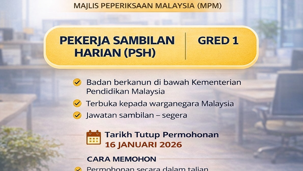 Jawatan Pekerja Sambilan Harian (PSH) Gred 1 di Majlis Peperiksaan Malaysia adalah peluang baik untuk calon yang ingin mencari pengalaman kerja. Pastikan anda mohon sebelum 16 Januari 2026 melalui pautan rasmi: