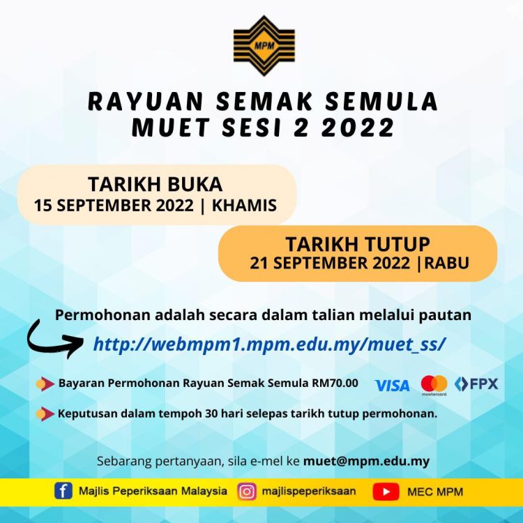 Ikuti perkongsian i bawah untuk maklumat lanjut dan panduan buat permohonan rayuan semak semula MUET sesi 2 tahun 2022.