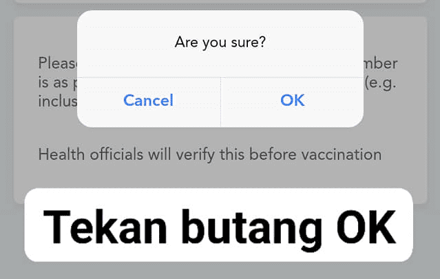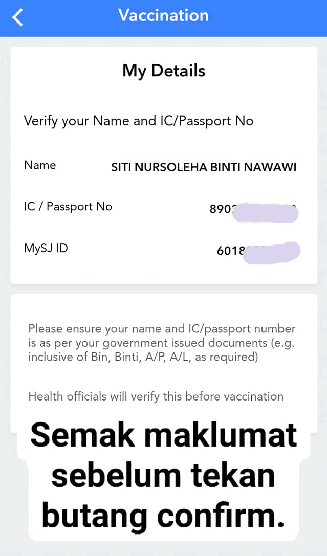 Klik Vaccine for____ dan sahkan maklumat nama, nombor kad pengenalan dan nombor telefon.