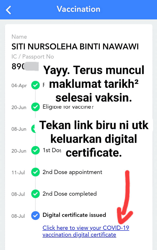 Siap! Mudah kan? Kini anda dah ada sijil vaksinasi anda di Mysejahtera sendiri. Senang lah selepas ini untuk pelbagai urusan.