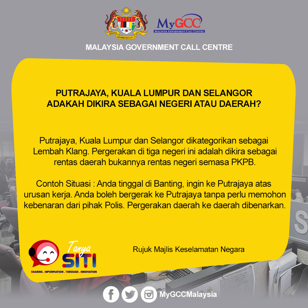 Menerusi Malaysia Government Call Centre (MyGCC), mereka yang duduk dan nak travel antara kawasan Putrajaya, Selangor dan Kuala Lumpur tak perlu mohon untuk buat rentas negeri.