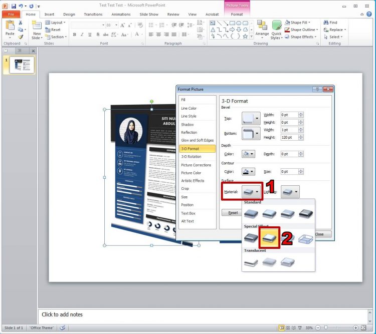 5) Masih lagi kat 3D Format, klik Material, pilih Special Effect yang saya kotakkan. Kalau prefer special effect yang lain pun boleh. Ikut kesesuaian.