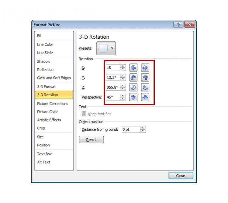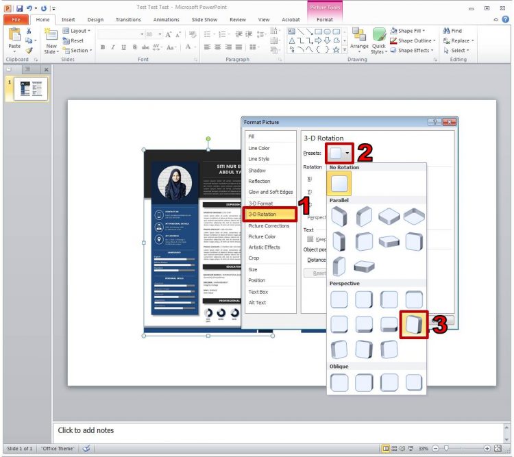 2) Klik 3D rotation, klik presets, klik perspective yang sesuai.