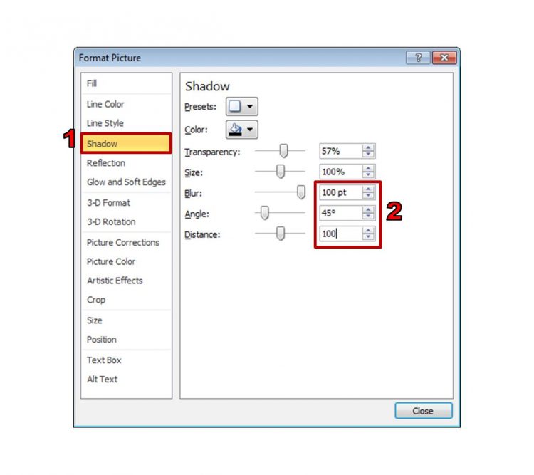 6) Sekarang klik Shadow. Tukar 3 benda yang saya box kan tu. Biasa saya memang guna 100, 45, 100. Tapi kalau nak try and error supaya jadi lain pun, bolehh. No problem. Dah siap, tekan Close.