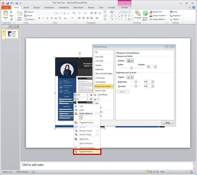 1) Klik Save As, tukar format jadi JPEG, Klik Save. Lepas save, saya bukak powerpoint baru, then saya copy paste gambar JPEG tadi and letak sebelah-sebelah. Betulkan size lebih kurang. Then saya right click kat gambar, and saya tekan “Format Picture”
