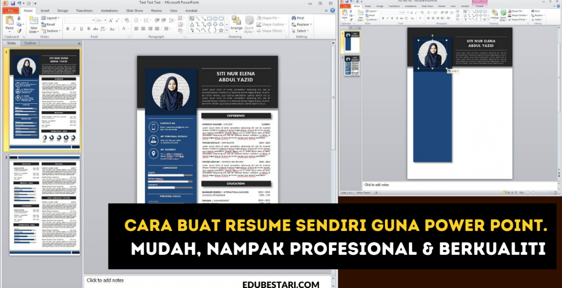 Selepas ini tiada lagi alasan untuk anda MALAS atau TAK TAHU buat resume sendiri. Dengan power point dah boleh buat resume dengan mudah! Seorang pengguna laman Facebook Syamim Al-Halim telah kongsikan panduan mudah buat resume sendiri menggunakan Power Point.