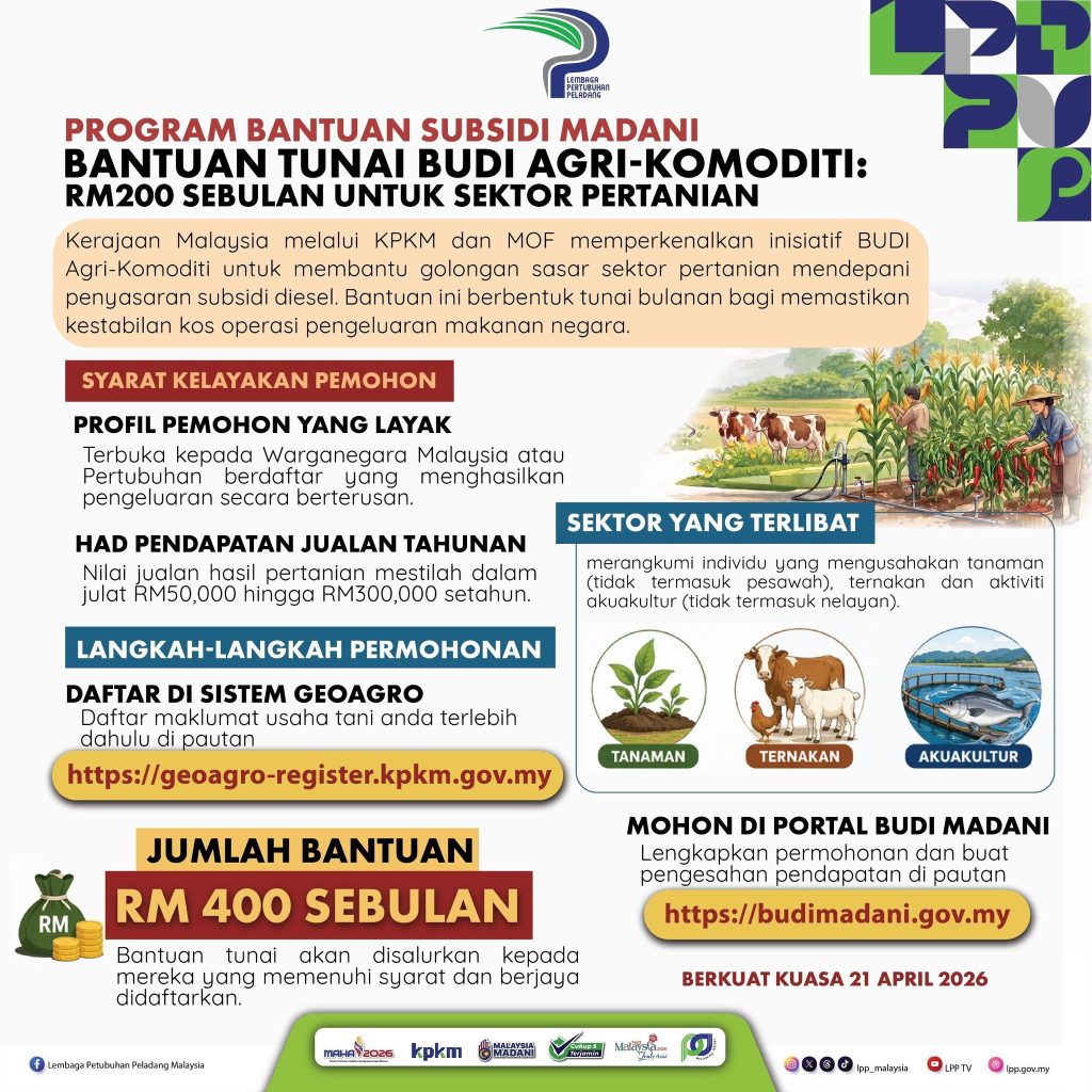 Bantuan BUDI Agri-Komoditi 2026 adalah peluang besar yang tidak patut dilepaskan. Dengan peningkatan kepada RM400 sebulan, ia mampu membantu ramai pengusaha pertanian menghadapi kos yang semakin meningkat.