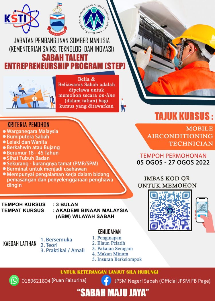Belia Negeri Sabah dipelawa untuk memohon kursus yang ditawarkan oleh Jabatan Pembangunan Sumber Manusia (JPSM) melalui Sabah Talent Entrepreneurship Program (STEP). Belia yang berkelayakan dan berminat akan mengikuti kursus secara bersemuka, teori dan praktikal selama 3 bulan di ABM Wilayah Sabah.
