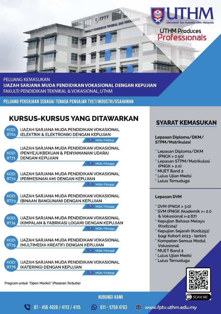 Permohonan kemasukan ke Program Sarjana Muda Pendidikan Vokasional UTHM ini telah dibuka dari 24 Februari sehingga 7 April 2020.