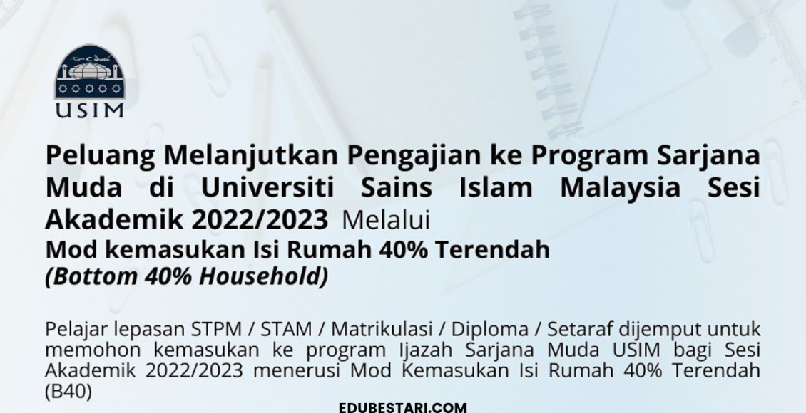 Universiti Sains Islam Malaysia (USIM) kini membuka peluang melanjutkan pengajian ke Program Sarjana Muda dalam pelbagai bidang bagi sesi akademik 2022/2023 melalui Mod Kemasukan Isi Rumah 40% terendah (Bottom 40% Household) atau B40.