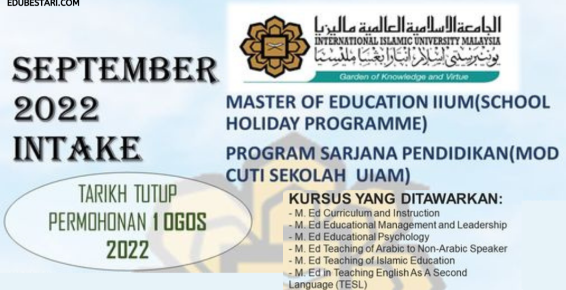 Universiti Islam Antarabangsa Malaysia (UIAM) mempelawa graduan lulusan Ijazah Sarjana Muda yang berminat nak sambung pengajian ke peringkat lebih tinggi dalam program Sarjana Pendidikan mohon program pengajian yang ditawarkan secara mod cuti sekolah.
