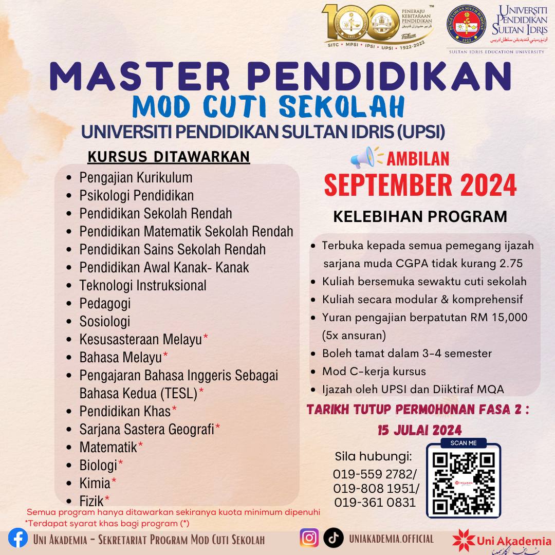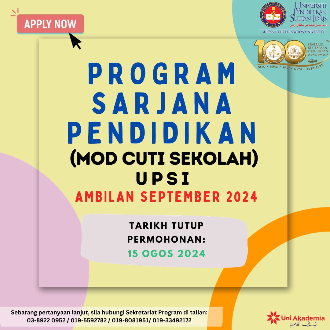 Program Pengajian Sarjana Pendidikan dalam pelbagai kursus ditawarkan ini akan dijalankan secara Mod Cuti Sekolah, iaitu pembelajaran hanya semasa cuti sekolah. Permohonan boleh dibuat sehingga 15 Ogos 2024 bagi calon yang ingin mengikuti pengajian September 2024.