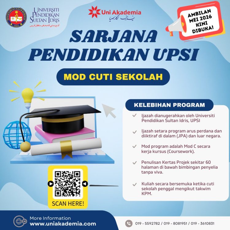 Program Sarjana Pendidikan UPSI Mod Cuti Sekolah Ambilan Mei 2026 merupakan peluang yang sangat baik untuk guru dan individu dalam bidang pendidikan meningkatkan tahap kelayakan akademik tanpa mengganggu kerjaya sedia ada.