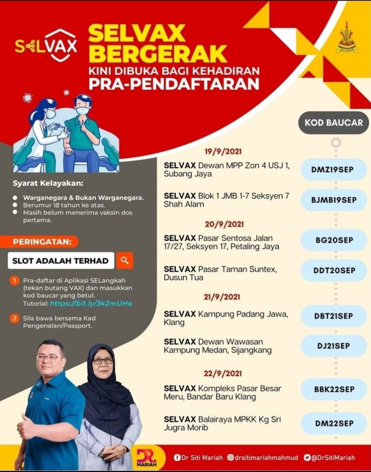 Rakyat Negeri Selangor yang masih belum dapatkan suntikan vaksinasi Covid-19 atau yang belum pernah mendaftar melalui MySejahtera, anda kini boleh dapatkan vaksin melalui Program SELVAX Bergerak, iaitu program vaksinasi bergerak.