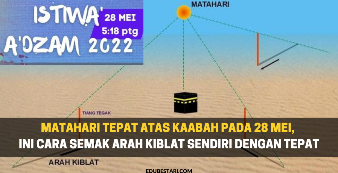 Umat Islam di Malaysia boleh membuat semakan tepat arah kiblat dengan hanya melihat bayang matahari pada 28 Mei 2022 (Sabtu) ini. Ia susulan fenomena dikenali sebagai Istiwa’ A’dzam atau kedudukan matahari berada pada titik zenith iaitu atas Kaabah di Masjidil Haram, Mekah, Arab Saudi ketika waktu berkenaan.