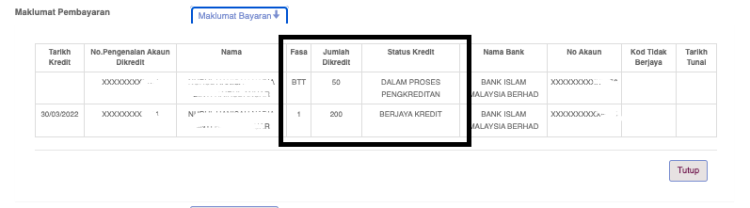 - Maklumat status terkini bayaran BKM anda akan dipaparkan di bahagian Status Kredit