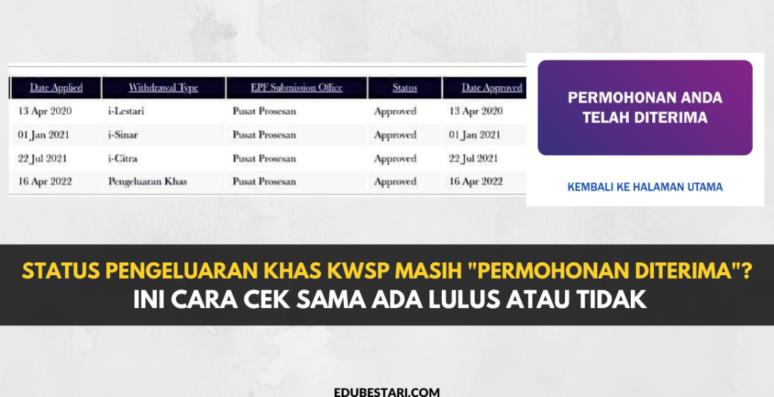 Sekiranya anda mendapat status “Permohonan Anda Telah Diterima”, ini bermaksud permohonan Pengeluaran Khas anda telah berjaya DITERIMA oleh pihak KWSP. Permohonan anda sedang disemak dan akan diproses secara berperingkat.