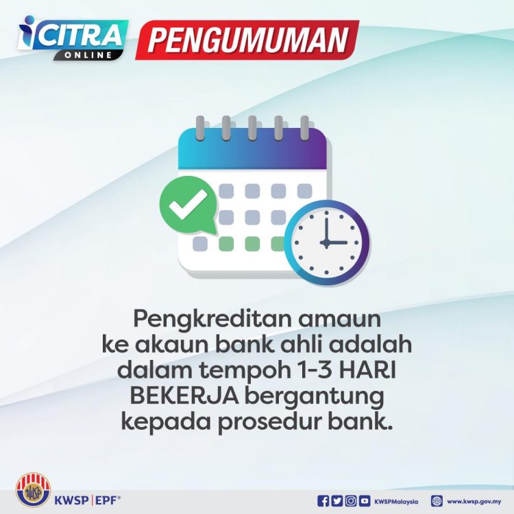 Pengkreditan amaun ke akaun bank ahli adalah dalam tempoh 1 – 3 HARI BEKERJA bergantung kepada prosedur bank. Bagi bayaran secara Arahan Bayaran, anda akan menerima Notis Pengambilan atau dihubungi oleh cawangan KWSP yang dipilih untuk urusan pengambilan Arahan Bayaran.
