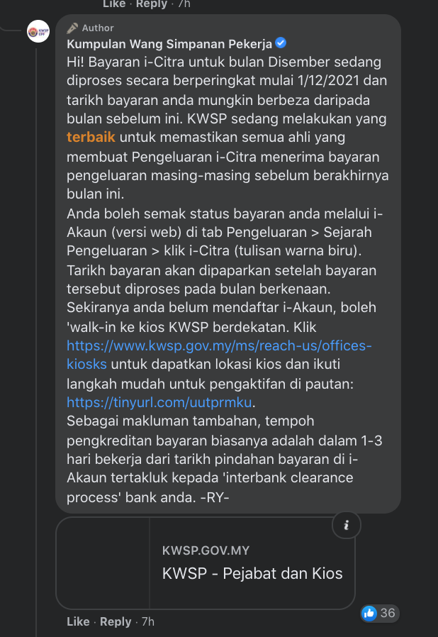Sejak 12 Julai lalu, Ahli KWSP yang memenuhi syarat pengeluaran i-Citra dah boleh buat permohonan pengeluaran sehingga RM5000. Terkini, KWSP telah memaklumkan Ahli yang telah buat permohonan dah boleh buat semakan status permohonan secara online.