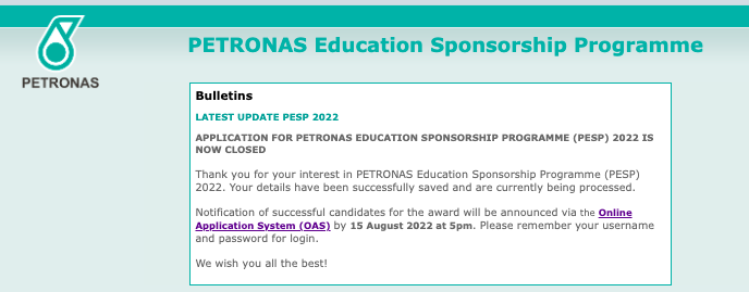 Pada 16 Jun 2022 lalu, PETRONAS telah membuka peluang permohonan biasiswa buat lepasan SPM yang ingin sambung pengajian dalam dan luar negara. Calon yang telah membuat permohonan pada tempoh permohonan dibuka boleh buat semakan kelayakan pada tarikh yang ditetapkan.