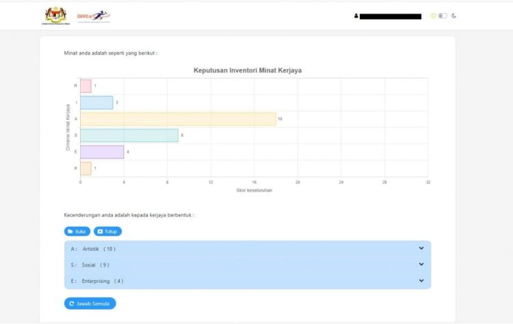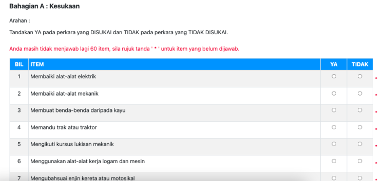 Penerangan akan diberikan berdasarkan Gaya Individu serta Persekitaran Pekerjaan yang dipadankan dengan minat anda. Melalui ujian ini, anda oleh lah buat pilihan yang tepat bagi haluan kerjaya nanti.