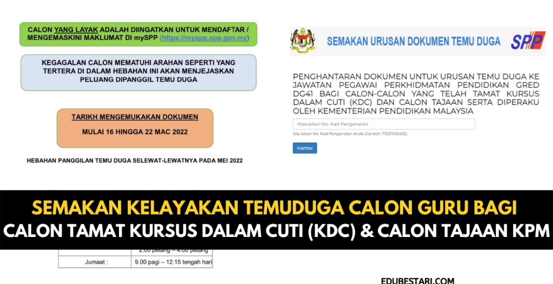 Calon yang telah tamat Kursus Dalam Cuti (KDC) dan Calon Tajaan Kementerian Pendidikan Malaysia diminta ambil perhatian. Suruhanjaya Perkhidmatan Pendidikan (SPP) akan melaksanakan urusan temuduga lantikan tetap ke Jawatan Pegawai Perkhidmatan Pendidikan Gred DG41 bagi calon yang terlibat.