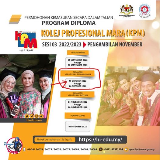 - Tarikh semakan keputusan permohonan : 19 Oktober 2022 hingga 26 Oktober 2022
