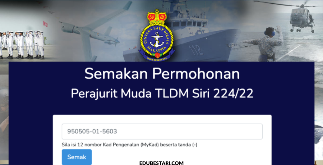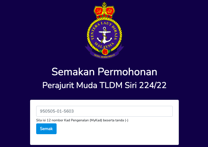 Bagi calon yang telah buat permohonan sebelum ini, semakan keputusan pendaftaran pemilihan perajurit muda TLDM siri 224/22 boleh dibuat dengan ikut langkah berikut: