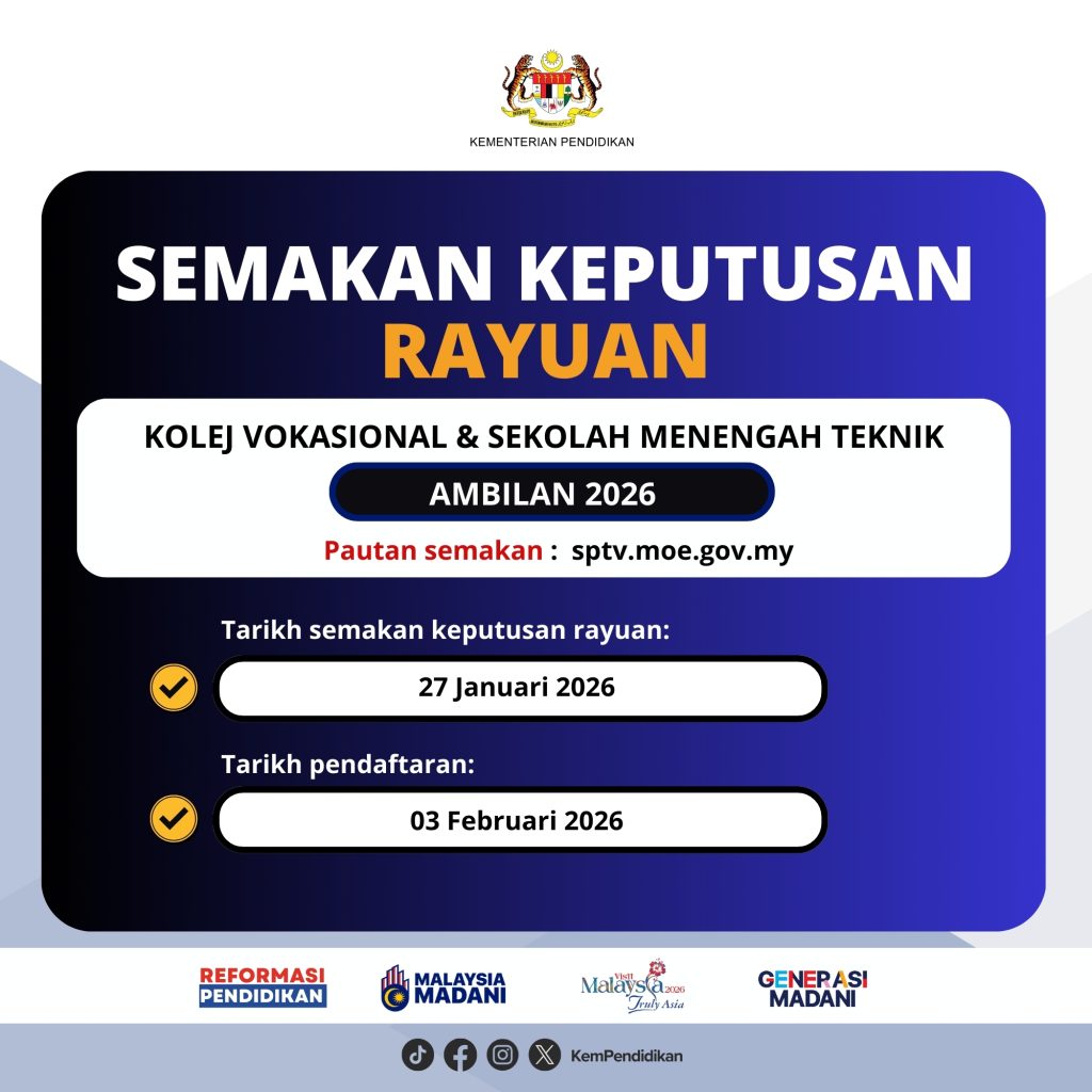 Tarikh semakan keputusan rayuan ini merupakan peluang penting kepada calon yang masih menunggu keputusan untuk menyambung pengajian di Kolej Vokasional atau Sekolah Menengah Teknik bagi ambilan 2026.