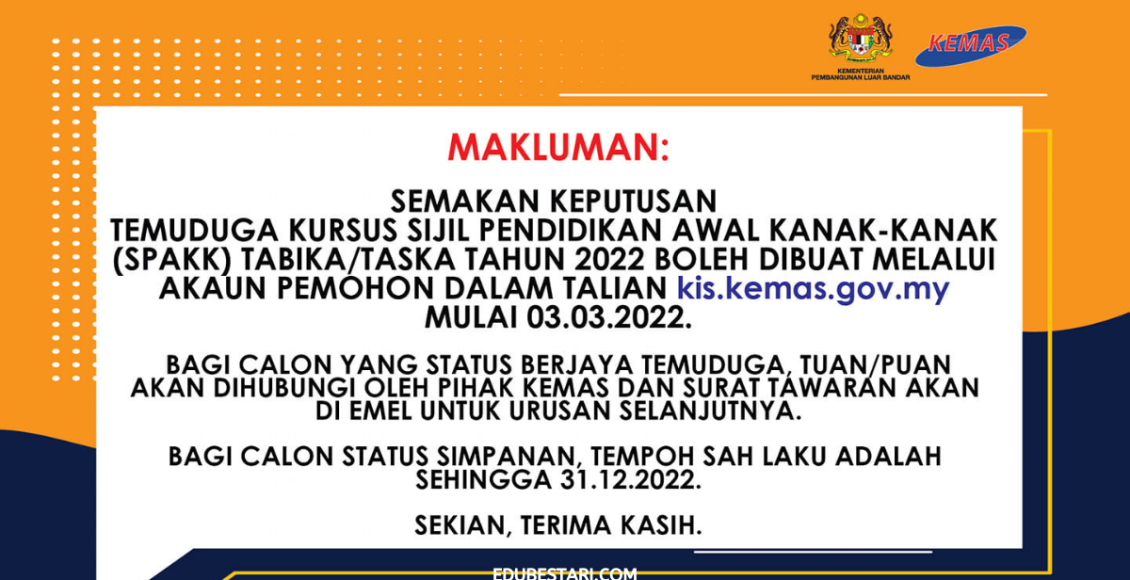 Namun kini KEMAS Jabatan Kemajuan Masyarakat telah memaklumkan bahawa calon yang telah buat permohonan kini boleh buat semakan keputusan temuduga bagi Kursus Sijil Pendidikan Awal Kanak-Kanak (SPAK) Tabika/ Taska Kemas Tahun 2022