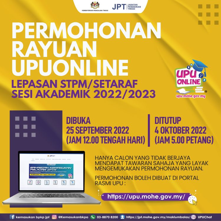 Permohonan rayuan boleh dibuat sehingga 4 Oktober 2022 sahaja. Pastikan anda buat permohonan sebelum tarikh tutup tersebut.