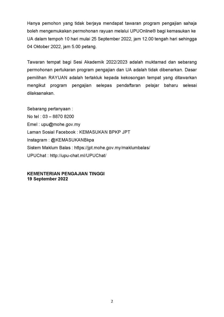 Hanya calon yang gagal mendapat tawaran selepas buat semakan layak untuk mengemukakan permohonan rayuan dalam tempoh 10 hari mulai 25 September 2022 Permohonan rayuan boleh dibuat di Portal Rasmi UPU berikut: