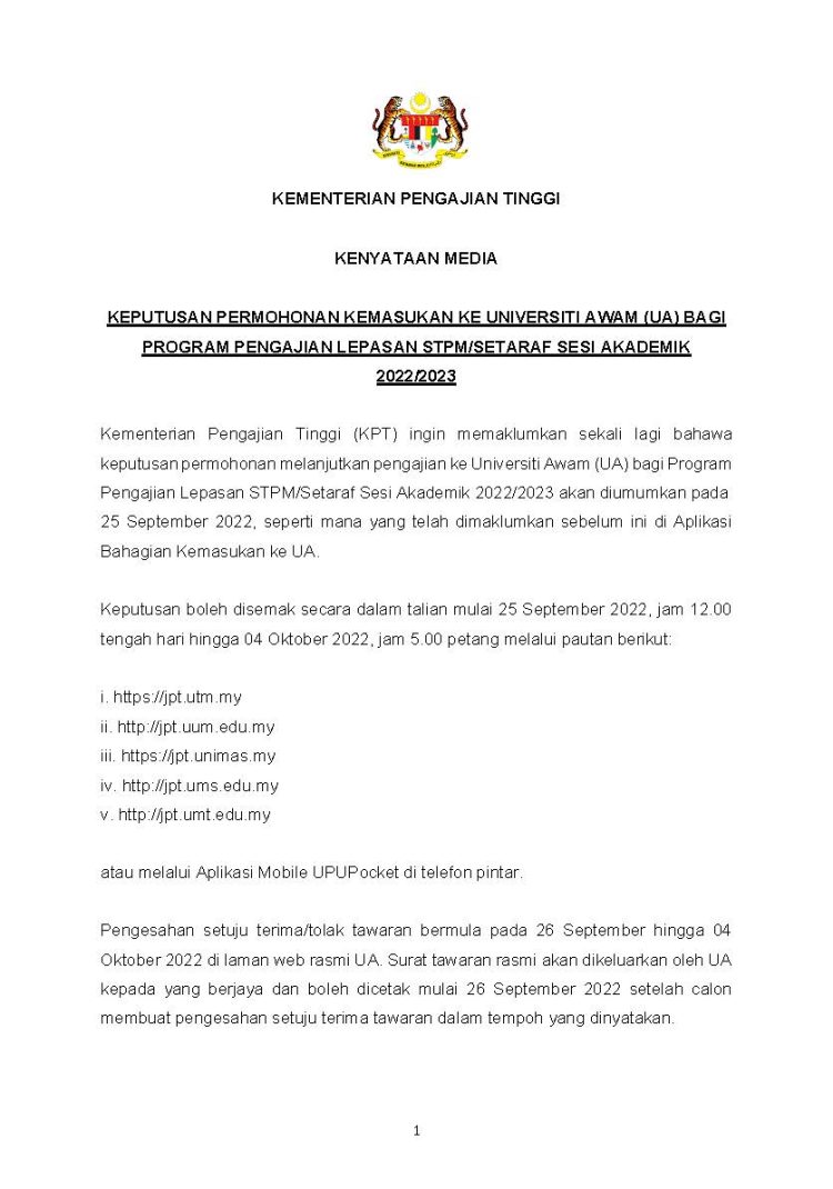 Pengesahan setuju terima/ tolak tawaran bermula pada 26 September hingga 4 Oktober 2022 di laman web rasmi UA. Surat tawaran rasmi akan dikeluarkan oleh UA kepada yang berjaya dan boleh dicetak mulai 26 September 2022 setelah calon membuat pengesahan setuju terima tawaran dalam tempoh yang dinyatakan.