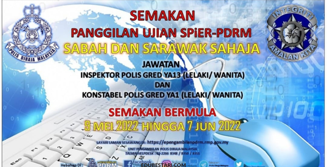 Perhatian! Semua calon yang telah melepasi pemeriksaan ujian fizikal pada tahun 2022 dikehendaki untuk membuat semakan panggilan ujian SPiER- PDRM bermula pada 9 Mei 2022 secara online bagi calon semenanjung. Semakan status ujian SPiER-PDRM lulus atau gagal boleh dilakukan dalam sistem e-pengambilan PDRM.