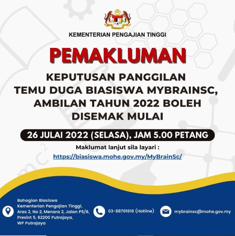 Semakan keputusan panggilan temuduga bagi Biasiswa MyBrainSc ambilan tahun 2022 adalah pada: