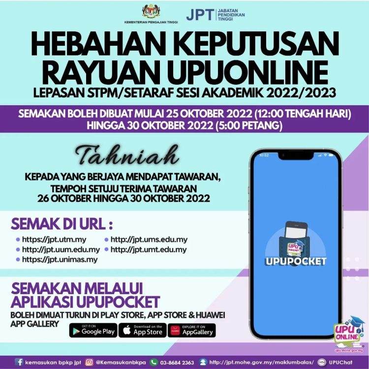 Semakan keputusan rayuan juga boleh dibuat melalui aplikasi UPUPocket yang boleh dimuat turun di PlayStore & AppStore.
