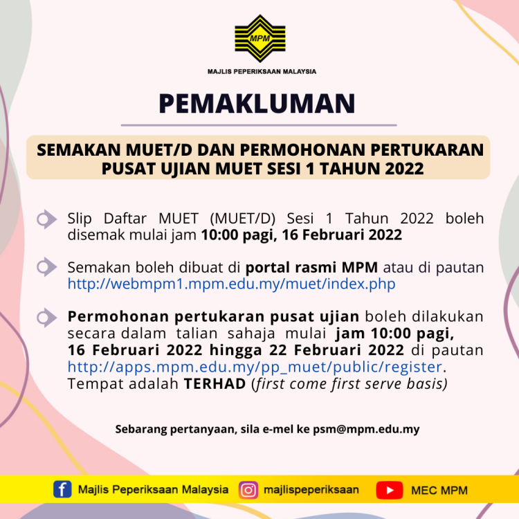 Permohonan pertukaran pusat ujian MUET Sesi 1 Tahun 2022 boleh dibuat secara atas talian sehingga 22 Februari 2022 di pautan berikut: