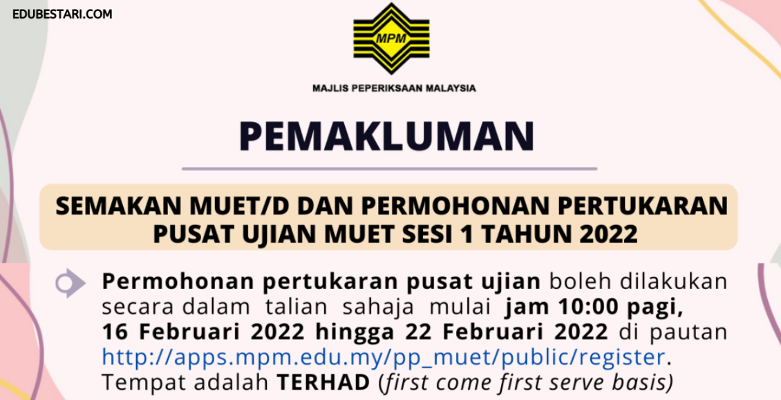 Permohonan pertukaran pusat ujian MUET Sesi 1 Tahun 2022 boleh dibuat secara atas talian sehingga 22 Februari 2022 di pautan berikut: