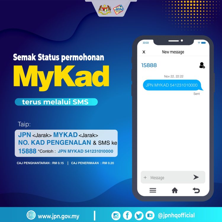 Semakan status permohonan MyKad boleh dibuat melalui SMS dengan ikut panduan berikut: