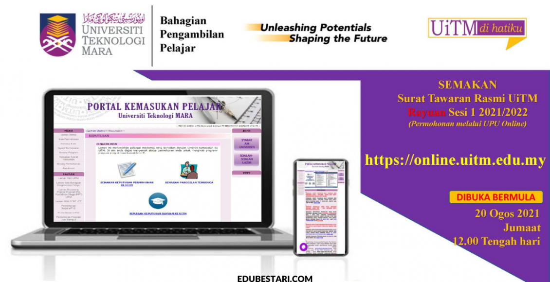 Perhatian calon lepasan SPM 2020 yang telah mohon kemasukan ke UiTM! Anda kini dah boleh semak surat tawaran rasmi UiTM rayuan bagi program asasi, diploma dan AP234 sesi pengajian 2021/2022.