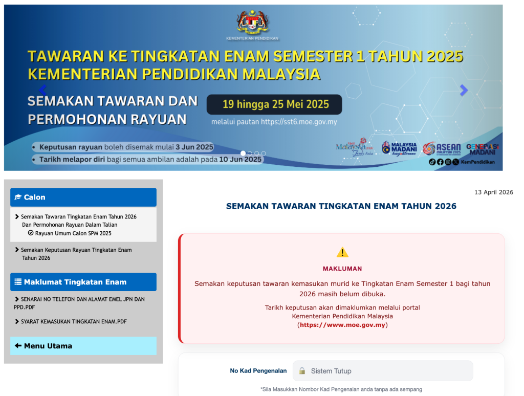 Semakan tawaran Tingkatan 6 2026 dijangka dibuka sekitar pertengahan Mei 2026 melalui portal rasmi KPM. Calon hanya perlu masukkan nombor kad pengenalan untuk menyemak keputusan dan memuat turun surat tawaran.