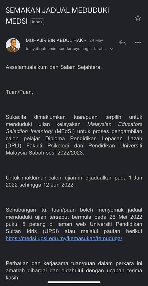 Calon juga dinasihatkan untuk buat semakan jadual melalui email yang telah didaftarkan semasa permohonan. Setiap calon akan menerima email bagi penjadualan ujian masing-masing.