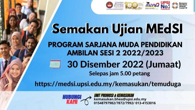 Bagi calon lepasan STPM/ Setaraf yang telah mohon kemasukan ke Program Ijazah Sarjana Muda Pendidikan di UPSI bagi sesi 2 2022/2023, anda boleh buat semakan panggilan ujian MEdSI pada tarikh ditetapkan secara atas talian.