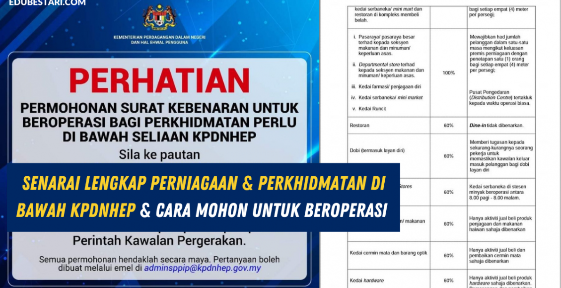 Perniagaan dan perkhidmatan yang tersenarai di bawah seliaan KPDNHEP boleh buat permohonan surat kebenaran untuk beroperasi bagi perkhidmatan perlu dalam tempoh penutupan penuh Perintah Kawalan Pergerakan (PKP) melalui pautan yang disediakan: