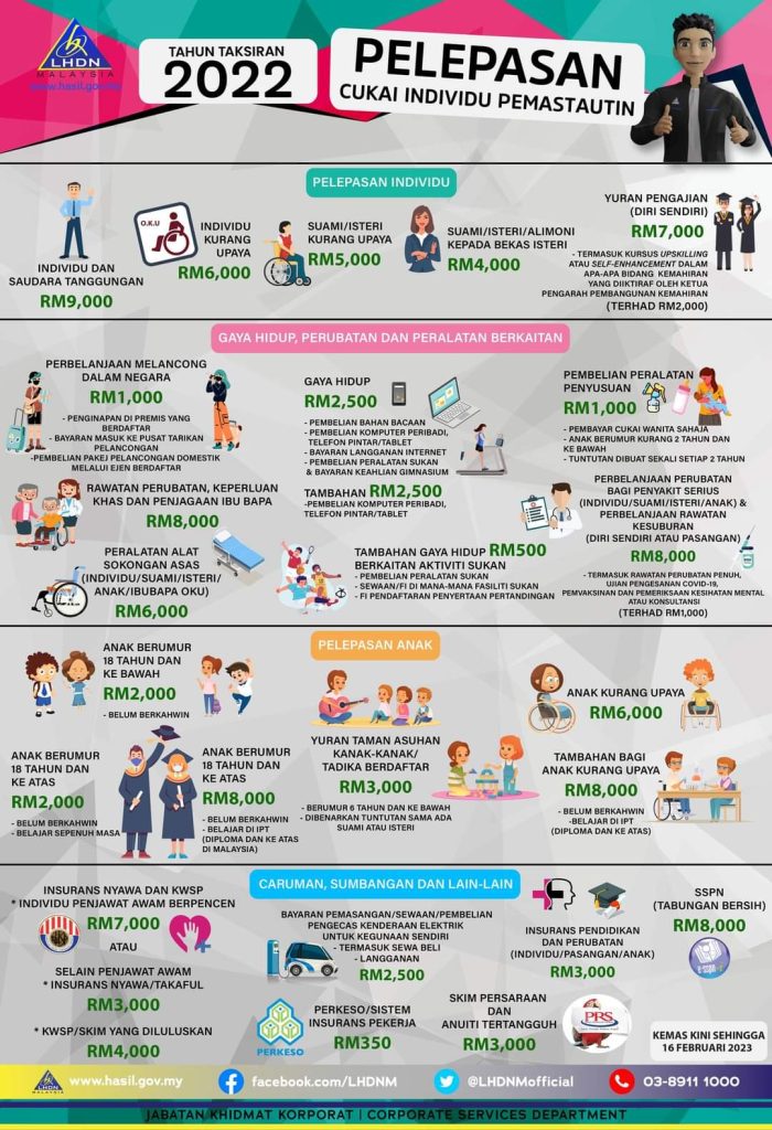 Melalui laman Facebook, Lembaga Hasil Dalam Negeri (LHDN) telah mengeluarkan senarai pelepasan cukai bagi tahun taksiran 2022 yang boleh dituntut oleh para pembayar cukai pendapatan.