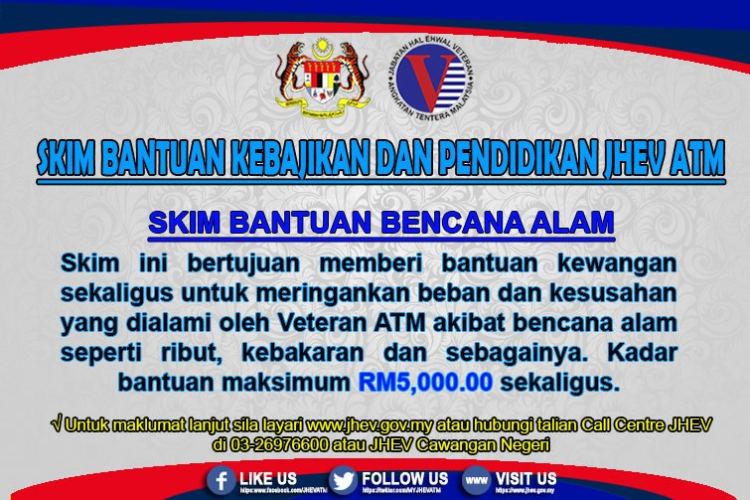 Jabatan Hal Ehwal Veteran ATM (JPEV) menawarkan Skim Bantuan Bencana Alam yang bertujuan untuk memberi bantuan kewangan sekaligus untuk meringankan beban dan kesusahan yang dialami oleh Veteran ATM akibat bencana alam seperti ribut, kebakaran dan sebagainya.