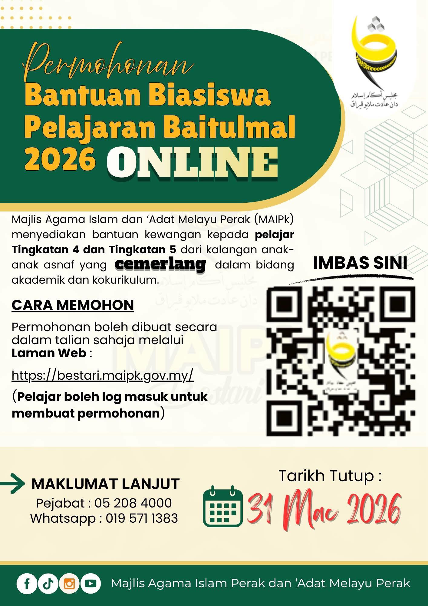 Bantuan Biasiswa Pelajaran Baitulmal merupakan inisiatif MAIPk melalui dana zakat dan Baitulmal untuk menyokong pendidikan anak-anak asnaf di negeri Perak. Program ini bukan sahaja membantu dari segi kewangan, malah berperanan menggalakkan kecemerlangan akademik dan pembangunan sahsiah pelajar. Permohonan bagi tahun 2026 dibuka secara dalam talian sepenuhnya, selaras dengan sistem pengurusan bantuan pendidikan MAIPk.Siapakah Yang Layak Memohon?