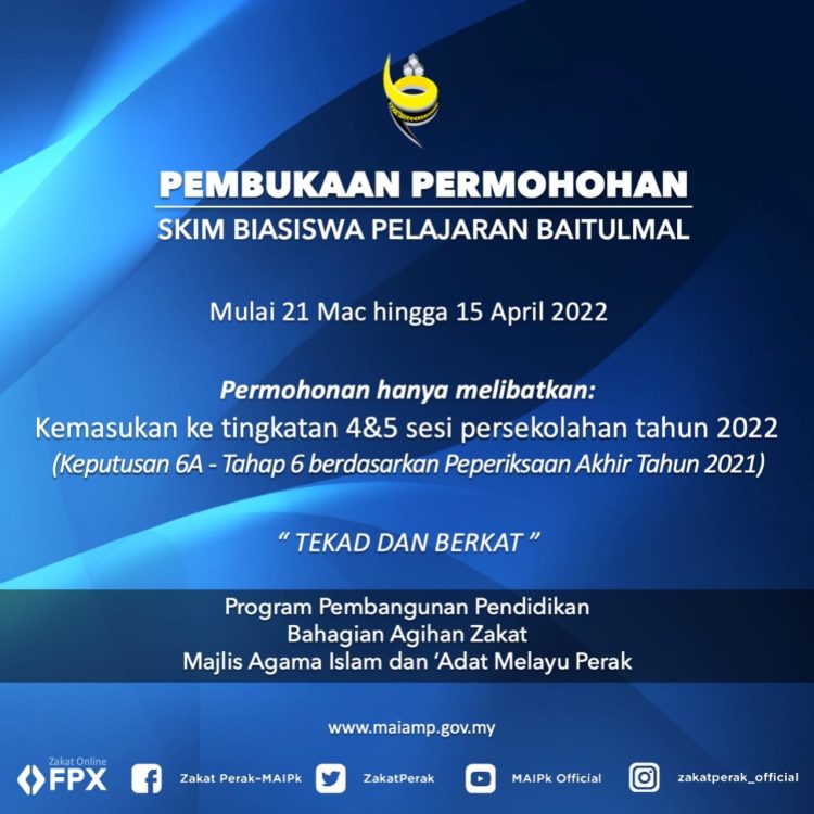 Permohonan Skim Biasiswa Pelajaran Baitumal tahun 2022 dibuka sepanjang tempoh berikut:
