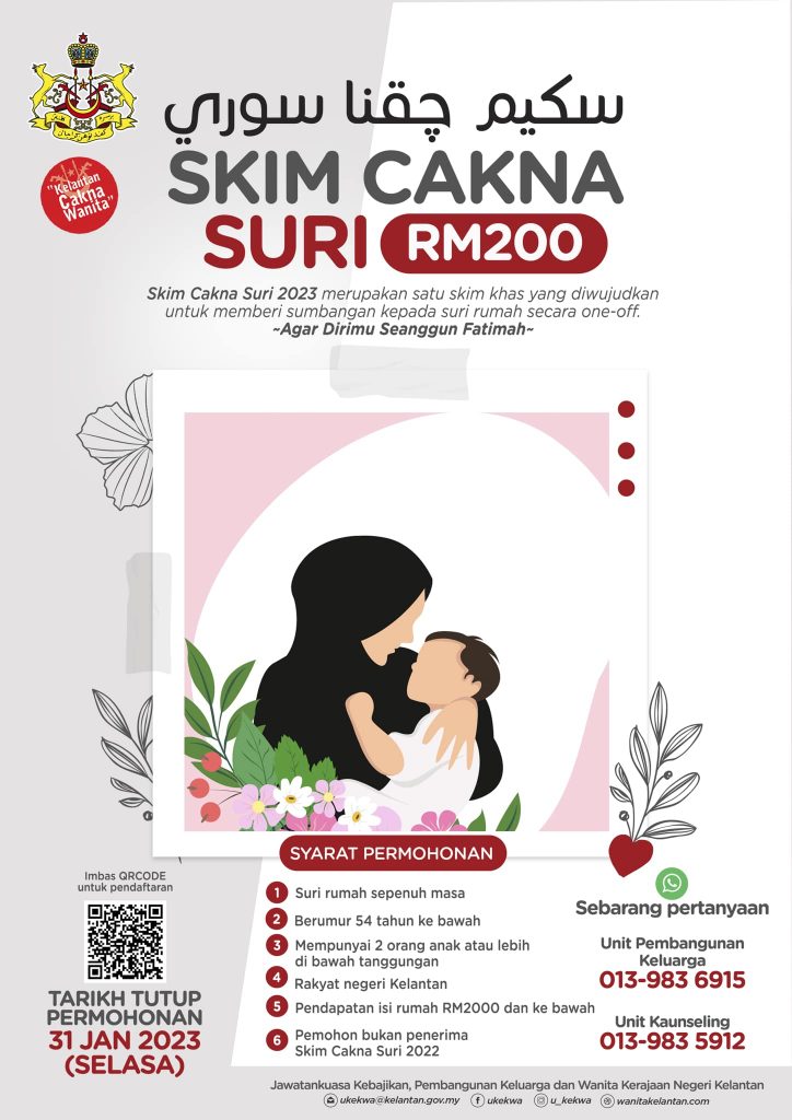 Untuk makluman anda, kini ada satu Bantuan SKIM CAKNA SURI akan diberikan kepada Isteri yang tidak berkerja atau suri rumah sepenuh masa yang ada suami dan berumur 54 tahun ke bawah. Pendaftaran Suri Cakna 2023 merupakan kesinambungan daripada Skim Cakna Suri yang diwujudkan pada tahun 2020.